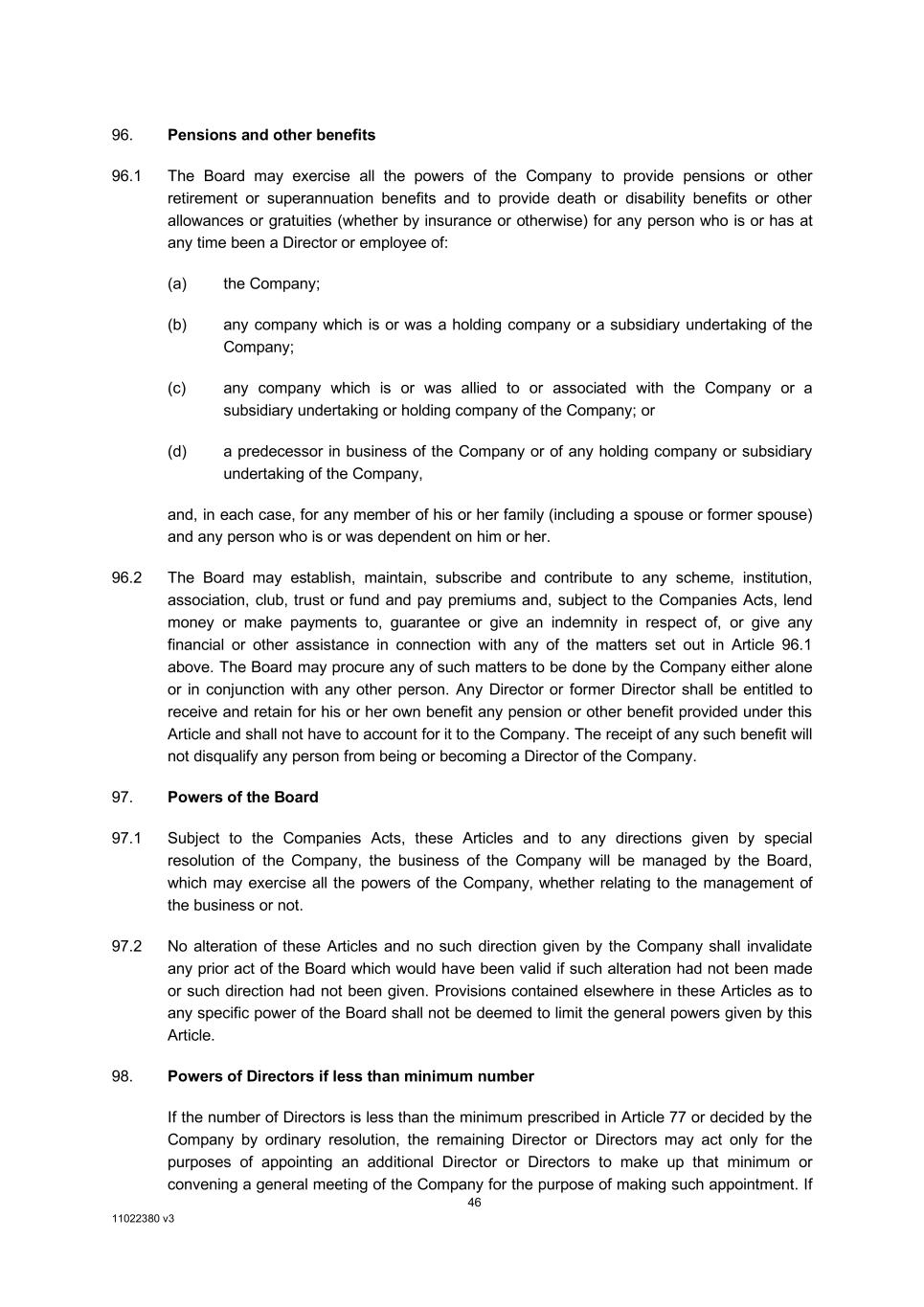 11022380 v3 46 96. Pensions and other benefits 96.1 The Board may exercise all the powers of the Company to provide pensions or other retirement or superannuation benefits and to provide death or disability benefits or other allowances or gratuities (whether by insurance or otherwise) for any person who is or has at any time been a Director or employee of: (a) the Company; (b) any company which is or was a holding company or a subsidiary undertaking of the Company; (c) any company which is or was allied to or associated with the Company or a subsidiary undertaking or holding company of the Company; or (d) a predecessor in business of the Company or of any holding company or subsidiary undertaking of the Company, and, in each case, for any member of his or her family (including a spouse or former spouse) and any person who is or was dependent on him or her. 96.2 The Board may establish, maintain, subscribe and contribute to any scheme, institution, association, club, trust or fund and pay premiums and, subject to the Companies Acts, lend money or make payments to, guarantee or give an indemnity in respect of, or give any financial or other assistance in connection with any of the matters set out in Article 96.1 above. The Board may procure any of such matters to be done by the Company either alone or in conjunction with any other person. Any Director or former Director shall be entitled to receive and retain for his or her own benefit any pension or other benefit provided under this Article and shall not have to account for it to the Company. The receipt of any such benefit will not disqualify any person from being or becoming a Director of the Company. 97. Powers of the Board 97.1 Subject to the Companies Acts, these Articles and to any directions given by special resolution of the Company, the business of the Company will be managed by the Board, which may exercise all the powers of the Company, whether relating to the management of the business or not. 97.2 No alteration of these Articles and no such direction given by the Company shall invalidate any prior act of the Board which would have been valid if such alteration had not been made or such direction had not been given. Provisions contained elsewhere in these Articles as to any specific power of the Board shall not be deemed to limit the general powers given by this Article. 98. Powers of Directors if less than minimum number If the number of Directors is less than the minimum prescribed in Article 77 or decided by the Company by ordinary resolution, the remaining Director or Directors may act only for the purposes of appointing an additional Director or Directors to make up that minimum or convening a general meeting of the Company for the purpose of making such appointment. If