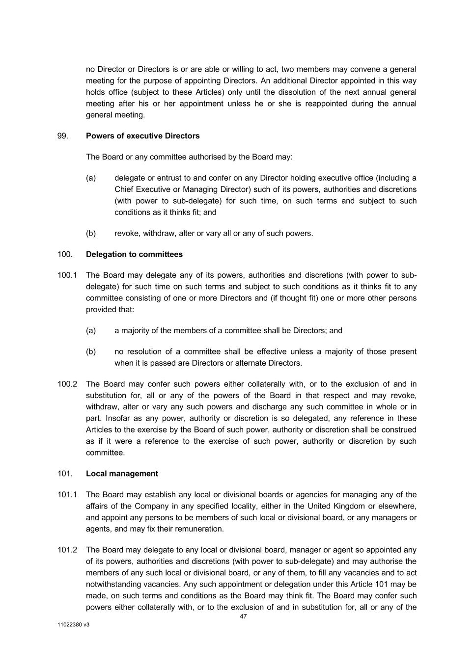 11022380 v3 47 no Director or Directors is or are able or willing to act, two members may convene a general meeting for the purpose of appointing Directors. An additional Director appointed in this way holds office (subject to these Articles) only until the dissolution of the next annual general meeting after his or her appointment unless he or she is reappointed during the annual general meeting. 99. Powers of executive Directors The Board or any committee authorised by the Board may: (a) delegate or entrust to and confer on any Director holding executive office (including a Chief Executive or Managing Director) such of its powers, authorities and discretions (with power to sub-delegate) for such time, on such terms and subject to such conditions as it thinks fit; and (b) revoke, withdraw, alter or vary all or any of such powers. 100. Delegation to committees 100.1 The Board may delegate any of its powers, authorities and discretions (with power to sub- delegate) for such time on such terms and subject to such conditions as it thinks fit to any committee consisting of one or more Directors and (if thought fit) one or more other persons provided that: (a) a majority of the members of a committee shall be Directors; and (b) no resolution of a committee shall be effective unless a majority of those present when it is passed are Directors or alternate Directors. 100.2 The Board may confer such powers either collaterally with, or to the exclusion of and in substitution for, all or any of the powers of the Board in that respect and may revoke, withdraw, alter or vary any such powers and discharge any such committee in whole or in part. Insofar as any power, authority or discretion is so delegated, any reference in these Articles to the exercise by the Board of such power, authority or discretion shall be construed as if it were a reference to the exercise of such power, authority or discretion by such committee. 101. Local management 101.1 The Board may establish any local or divisional boards or agencies for managing any of the affairs of the Company in any specified locality, either in the United Kingdom or elsewhere, and appoint any persons to be members of such local or divisional board, or any managers or agents, and may fix their remuneration. 101.2 The Board may delegate to any local or divisional board, manager or agent so appointed any of its powers, authorities and discretions (with power to sub-delegate) and may authorise the members of any such local or divisional board, or any of them, to fill any vacancies and to act notwithstanding vacancies. Any such appointment or delegation under this Article 101 may be made, on such terms and conditions as the Board may think fit. The Board may confer such powers either collaterally with, or to the exclusion of and in substitution for, all or any of the