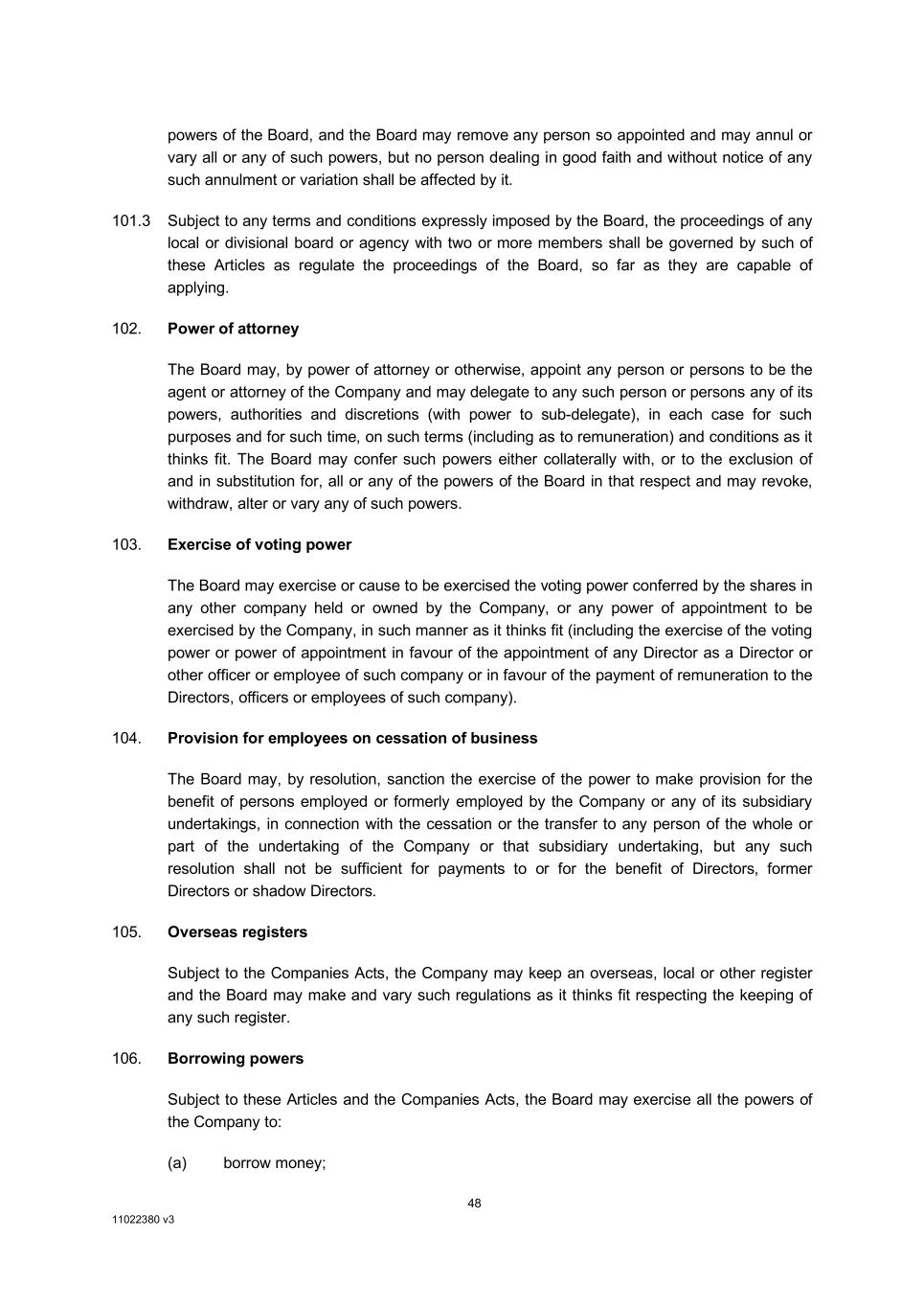 11022380 v3 48 powers of the Board, and the Board may remove any person so appointed and may annul or vary all or any of such powers, but no person dealing in good faith and without notice of any such annulment or variation shall be affected by it. 101.3 Subject to any terms and conditions expressly imposed by the Board, the proceedings of any local or divisional board or agency with two or more members shall be governed by such of these Articles as regulate the proceedings of the Board, so far as they are capable of applying. 102. Power of attorney The Board may, by power of attorney or otherwise, appoint any person or persons to be the agent or attorney of the Company and may delegate to any such person or persons any of its powers, authorities and discretions (with power to sub-delegate), in each case for such purposes and for such time, on such terms (including as to remuneration) and conditions as it thinks fit. The Board may confer such powers either collaterally with, or to the exclusion of and in substitution for, all or any of the powers of the Board in that respect and may revoke, withdraw, alter or vary any of such powers. 103. Exercise of voting power The Board may exercise or cause to be exercised the voting power conferred by the shares in any other company held or owned by the Company, or any power of appointment to be exercised by the Company, in such manner as it thinks fit (including the exercise of the voting power or power of appointment in favour of the appointment of any Director as a Director or other officer or employee of such company or in favour of the payment of remuneration to the Directors, officers or employees of such company). 104. Provision for employees on cessation of business The Board may, by resolution, sanction the exercise of the power to make provision for the benefit of persons employed or formerly employed by the Company or any of its subsidiary undertakings, in connection with the cessation or the transfer to any person of the whole or part of the undertaking of the Company or that subsidiary undertaking, but any such resolution shall not be sufficient for payments to or for the benefit of Directors, former Directors or shadow Directors. 105. Overseas registers Subject to the Companies Acts, the Company may keep an overseas, local or other register and the Board may make and vary such regulations as it thinks fit respecting the keeping of any such register. 106. Borrowing powers Subject to these Articles and the Companies Acts, the Board may exercise all the powers of the Company to: (a) borrow money;