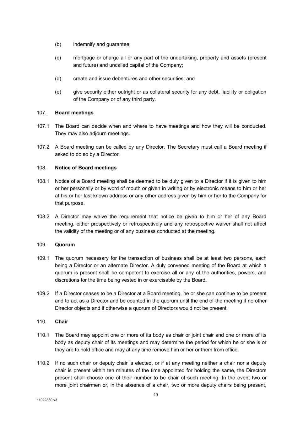11022380 v3 49 (b) indemnify and guarantee; (c) mortgage or charge all or any part of the undertaking, property and assets (present and future) and uncalled capital of the Company; (d) create and issue debentures and other securities; and (e) give security either outright or as collateral security for any debt, liability or obligation of the Company or of any third party. 107. Board meetings 107.1 The Board can decide when and where to have meetings and how they will be conducted. They may also adjourn meetings. 107.2 A Board meeting can be called by any Director. The Secretary must call a Board meeting if asked to do so by a Director. 108. Notice of Board meetings 108.1 Notice of a Board meeting shall be deemed to be duly given to a Director if it is given to him or her personally or by word of mouth or given in writing or by electronic means to him or her at his or her last known address or any other address given by him or her to the Company for that purpose. 108.2 A Director may waive the requirement that notice be given to him or her of any Board meeting, either prospectively or retrospectively and any retrospective waiver shall not affect the validity of the meeting or of any business conducted at the meeting. 109. Quorum 109.1 The quorum necessary for the transaction of business shall be at least two persons, each being a Director or an alternate Director. A duly convened meeting of the Board at which a quorum is present shall be competent to exercise all or any of the authorities, powers, and discretions for the time being vested in or exercisable by the Board. 109.2 If a Director ceases to be a Director at a Board meeting, he or she can continue to be present and to act as a Director and be counted in the quorum until the end of the meeting if no other Director objects and if otherwise a quorum of Directors would not be present. 110. Chair 110.1 The Board may appoint one or more of its body as chair or joint chair and one or more of its body as deputy chair of its meetings and may determine the period for which he or she is or they are to hold office and may at any time remove him or her or them from office. 110.2 If no such chair or deputy chair is elected, or if at any meeting neither a chair nor a deputy chair is present within ten minutes of the time appointed for holding the same, the Directors present shall choose one of their number to be chair of such meeting. In the event two or more joint chairmen or, in the absence of a chair, two or more deputy chairs being present,