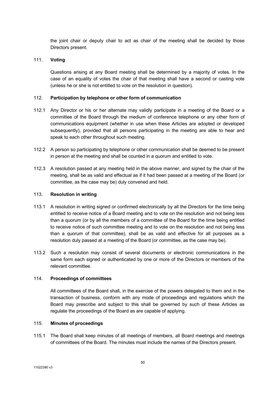 11022380 v3 50 the joint chair or deputy chair to act as chair of the meeting shall be decided by those Directors present. 111. Voting Questions arising at any Board meeting shall be determined by a majority of votes. In the case of an equality of votes the chair of that meeting shall have a second or casting vote (unless he or she is not entitled to vote on the resolution in question). 112. Participation by telephone or other form of communication 112.1 Any Director or his or her alternate may validly participate in a meeting of the Board or a committee of the Board through the medium of conference telephone or any other form of communications equipment (whether in use when these Articles are adopted or developed subsequently), provided that all persons participating in the meeting are able to hear and speak to each other throughout such meeting. 112.2 A person so participating by telephone or other communication shall be deemed to be present in person at the meeting and shall be counted in a quorum and entitled to vote. 112.3 A resolution passed at any meeting held in the above manner, and signed by the chair of the meeting, shall be as valid and effectual as if it had been passed at a meeting of the Board (or committee, as the case may be) duly convened and held. 113. Resolution in writing 113.1 A resolution in writing signed or confirmed electronically by all the Directors for the time being entitled to receive notice of a Board meeting and to vote on the resolution and not being less than a quorum (or by all the members of a committee of the Board for the time being entitled to receive notice of such committee meeting and to vote on the resolution and not being less than a quorum of that committee), shall be as valid and effective for all purposes as a resolution duly passed at a meeting of the Board (or committee, as the case may be). 113.2 Such a resolution may consist of several documents or electronic communications in the same form each signed or authenticated by one or more of the Directors or members of the relevant committee. 114. Proceedings of committees All committees of the Board shall, in the exercise of the powers delegated to them and in the transaction of business, conform with any mode of proceedings and regulations which the Board may prescribe and subject to this shall be governed by such of these Articles as regulate the proceedings of the Board as are capable of applying. 115. Minutes of proceedings 115.1 The Board shall keep minutes of all meetings of members, all Board meetings and meetings of committees of the Board. The minutes must include the names of the Directors present.