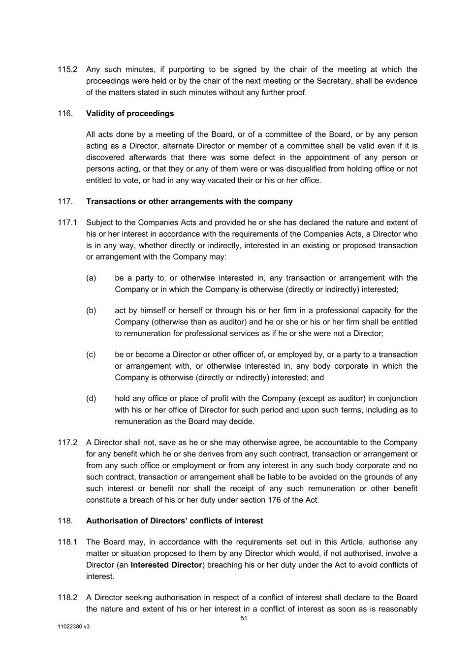 11022380 v3 51 115.2 Any such minutes, if purporting to be signed by the chair of the meeting at which the proceedings were held or by the chair of the next meeting or the Secretary, shall be evidence of the matters stated in such minutes without any further proof. 116. Validity of proceedings All acts done by a meeting of the Board, or of a committee of the Board, or by any person acting as a Director, alternate Director or member of a committee shall be valid even if it is discovered afterwards that there was some defect in the appointment of any person or persons acting, or that they or any of them were or was disqualified from holding office or not entitled to vote, or had in any way vacated their or his or her office. 117. Transactions or other arrangements with the company 117.1 Subject to the Companies Acts and provided he or she has declared the nature and extent of his or her interest in accordance with the requirements of the Companies Acts, a Director who is in any way, whether directly or indirectly, interested in an existing or proposed transaction or arrangement with the Company may: (a) be a party to, or otherwise interested in, any transaction or arrangement with the Company or in which the Company is otherwise (directly or indirectly) interested; (b) act by himself or herself or through his or her firm in a professional capacity for the Company (otherwise than as auditor) and he or she or his or her firm shall be entitled to remuneration for professional services as if he or she were not a Director; (c) be or become a Director or other officer of, or employed by, or a party to a transaction or arrangement with, or otherwise interested in, any body corporate in which the Company is otherwise (directly or indirectly) interested; and (d) hold any office or place of profit with the Company (except as auditor) in conjunction with his or her office of Director for such period and upon such terms, including as to remuneration as the Board may decide. 117.2 A Director shall not, save as he or she may otherwise agree, be accountable to the Company for any benefit which he or she derives from any such contract, transaction or arrangement or from any such office or employment or from any interest in any such body corporate and no such contract, transaction or arrangement shall be liable to be avoided on the grounds of any such interest or benefit nor shall the receipt of any such remuneration or other benefit constitute a breach of his or her duty under section 176 of the Act. 118. Authorisation of Directors’ conflicts of interest 118.1 The Board may, in accordance with the requirements set out in this Article, authorise any matter or situation proposed to them by any Director which would, if not authorised, involve a Director (an Interested Director) breaching his or her duty under the Act to avoid conflicts of interest. 118.2 A Director seeking authorisation in respect of a conflict of interest shall declare to the Board the nature and extent of his or her interest in a conflict of interest as soon as is reasonably