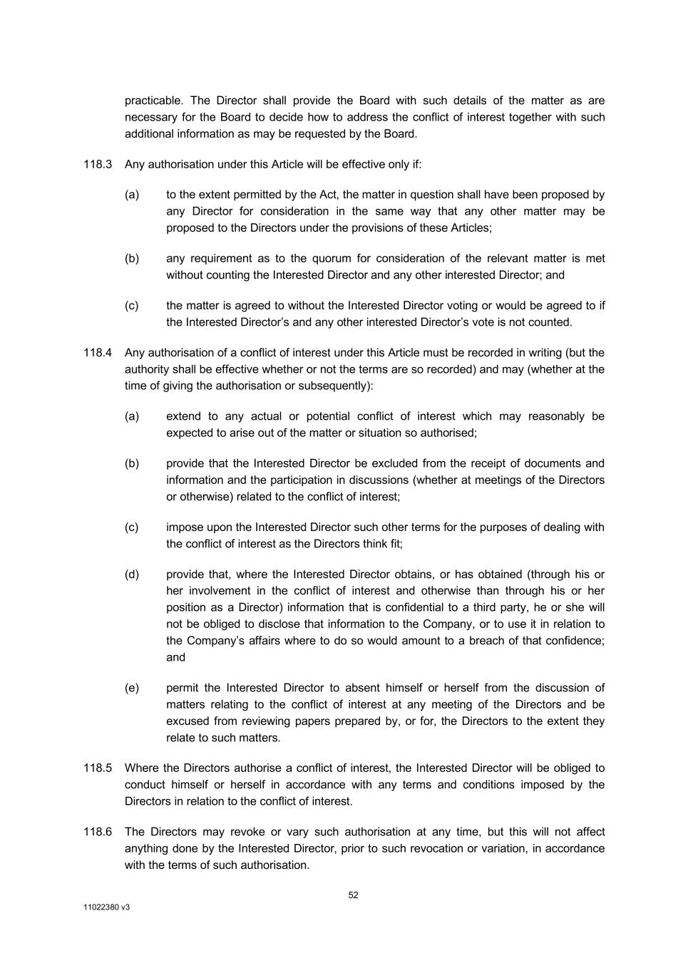 11022380 v3 52 practicable. The Director shall provide the Board with such details of the matter as are necessary for the Board to decide how to address the conflict of interest together with such additional information as may be requested by the Board. 118.3 Any authorisation under this Article will be effective only if: (a) to the extent permitted by the Act, the matter in question shall have been proposed by any Director for consideration in the same way that any other matter may be proposed to the Directors under the provisions of these Articles; (b) any requirement as to the quorum for consideration of the relevant matter is met without counting the Interested Director and any other interested Director; and (c) the matter is agreed to without the Interested Director voting or would be agreed to if the Interested Director’s and any other interested Director’s vote is not counted. 118.4 Any authorisation of a conflict of interest under this Article must be recorded in writing (but the authority shall be effective whether or not the terms are so recorded) and may (whether at the time of giving the authorisation or subsequently): (a) extend to any actual or potential conflict of interest which may reasonably be expected to arise out of the matter or situation so authorised; (b) provide that the Interested Director be excluded from the receipt of documents and information and the participation in discussions (whether at meetings of the Directors or otherwise) related to the conflict of interest; (c) impose upon the Interested Director such other terms for the purposes of dealing with the conflict of interest as the Directors think fit; (d) provide that, where the Interested Director obtains, or has obtained (through his or her involvement in the conflict of interest and otherwise than through his or her position as a Director) information that is confidential to a third party, he or she will not be obliged to disclose that information to the Company, or to use it in relation to the Company’s affairs where to do so would amount to a breach of that confidence; and (e) permit the Interested Director to absent himself or herself from the discussion of matters relating to the conflict of interest at any meeting of the Directors and be excused from reviewing papers prepared by, or for, the Directors to the extent they relate to such matters. 118.5 Where the Directors authorise a conflict of interest, the Interested Director will be obliged to conduct himself or herself in accordance with any terms and conditions imposed by the Directors in relation to the conflict of interest. 118.6 The Directors may revoke or vary such authorisation at any time, but this will not affect anything done by the Interested Director, prior to such revocation or variation, in accordance with the terms of such authorisation.