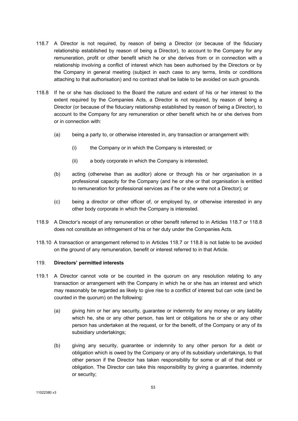 11022380 v3 53 118.7 A Director is not required, by reason of being a Director (or because of the fiduciary relationship established by reason of being a Director), to account to the Company for any remuneration, profit or other benefit which he or she derives from or in connection with a relationship involving a conflict of interest which has been authorised by the Directors or by the Company in general meeting (subject in each case to any terms, limits or conditions attaching to that authorisation) and no contract shall be liable to be avoided on such grounds. 118.8 If he or she has disclosed to the Board the nature and extent of his or her interest to the extent required by the Companies Acts, a Director is not required, by reason of being a Director (or because of the fiduciary relationship established by reason of being a Director), to account to the Company for any remuneration or other benefit which he or she derives from or in connection with: (a) being a party to, or otherwise interested in, any transaction or arrangement with: (i) the Company or in which the Company is interested; or (ii) a body corporate in which the Company is interested; (b) acting (otherwise than as auditor) alone or through his or her organisation in a professional capacity for the Company (and he or she or that organisation is entitled to remuneration for professional services as if he or she were not a Director); or (c) being a director or other officer of, or employed by, or otherwise interested in any other body corporate in which the Company is interested. 118.9 A Director’s receipt of any remuneration or other benefit referred to in Articles 118.7 or 118.8 does not constitute an infringement of his or her duty under the Companies Acts. 118.10 A transaction or arrangement referred to in Articles 118.7 or 118.8 is not liable to be avoided on the ground of any remuneration, benefit or interest referred to in that Article. 119. Directors’ permitted interests 119.1 A Director cannot vote or be counted in the quorum on any resolution relating to any transaction or arrangement with the Company in which he or she has an interest and which may reasonably be regarded as likely to give rise to a conflict of interest but can vote (and be counted in the quorum) on the following: (a) giving him or her any security, guarantee or indemnity for any money or any liability which he, she or any other person, has lent or obligations he or she or any other person has undertaken at the request, or for the benefit, of the Company or any of its subsidiary undertakings; (b) giving any security, guarantee or indemnity to any other person for a debt or obligation which is owed by the Company or any of its subsidiary undertakings, to that other person if the Director has taken responsibility for some or all of that debt or obligation. The Director can take this responsibility by giving a guarantee, indemnity or security;