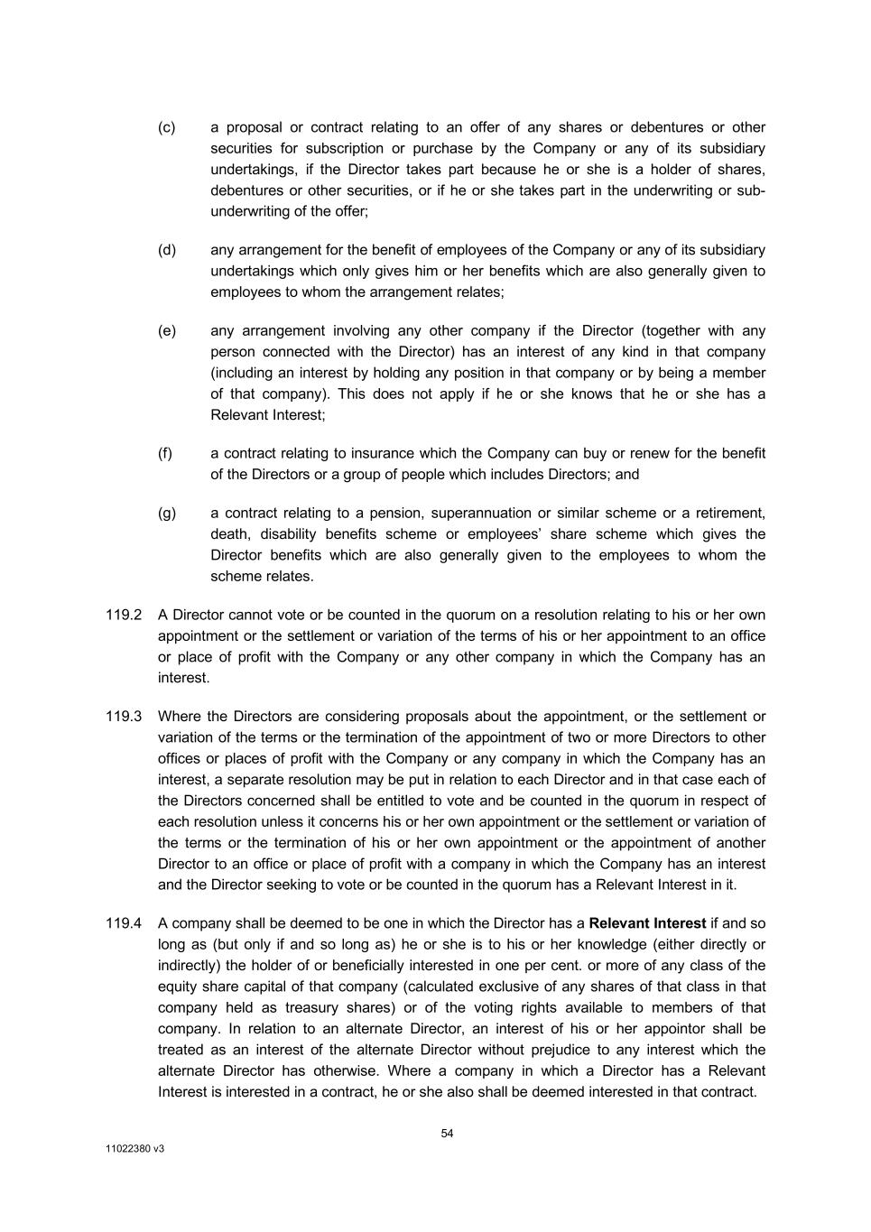 11022380 v3 54 (c) a proposal or contract relating to an offer of any shares or debentures or other securities for subscription or purchase by the Company or any of its subsidiary undertakings, if the Director takes part because he or she is a holder of shares, debentures or other securities, or if he or she takes part in the underwriting or sub- underwriting of the offer; (d) any arrangement for the benefit of employees of the Company or any of its subsidiary undertakings which only gives him or her benefits which are also generally given to employees to whom the arrangement relates; (e) any arrangement involving any other company if the Director (together with any person connected with the Director) has an interest of any kind in that company (including an interest by holding any position in that company or by being a member of that company). This does not apply if he or she knows that he or she has a Relevant Interest; (f) a contract relating to insurance which the Company can buy or renew for the benefit of the Directors or a group of people which includes Directors; and (g) a contract relating to a pension, superannuation or similar scheme or a retirement, death, disability benefits scheme or employees’ share scheme which gives the Director benefits which are also generally given to the employees to whom the scheme relates. 119.2 A Director cannot vote or be counted in the quorum on a resolution relating to his or her own appointment or the settlement or variation of the terms of his or her appointment to an office or place of profit with the Company or any other company in which the Company has an interest. 119.3 Where the Directors are considering proposals about the appointment, or the settlement or variation of the terms or the termination of the appointment of two or more Directors to other offices or places of profit with the Company or any company in which the Company has an interest, a separate resolution may be put in relation to each Director and in that case each of the Directors concerned shall be entitled to vote and be counted in the quorum in respect of each resolution unless it concerns his or her own appointment or the settlement or variation of the terms or the termination of his or her own appointment or the appointment of another Director to an office or place of profit with a company in which the Company has an interest and the Director seeking to vote or be counted in the quorum has a Relevant Interest in it. 119.4 A company shall be deemed to be one in which the Director has a Relevant Interest if and so long as (but only if and so long as) he or she is to his or her knowledge (either directly or indirectly) the holder of or beneficially interested in one per cent. or more of any class of the equity share capital of that company (calculated exclusive of any shares of that class in that company held as treasury shares) or of the voting rights available to members of that company. In relation to an alternate Director, an interest of his or her appointor shall be treated as an interest of the alternate Director without prejudice to any interest which the alternate Director has otherwise. Where a company in which a Director has a Relevant Interest is interested in a contract, he or she also shall be deemed interested in that contract.