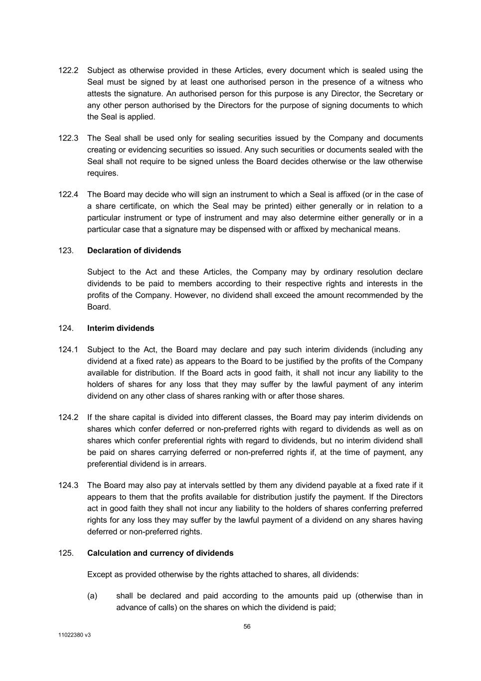 11022380 v3 56 122.2 Subject as otherwise provided in these Articles, every document which is sealed using the Seal must be signed by at least one authorised person in the presence of a witness who attests the signature. An authorised person for this purpose is any Director, the Secretary or any other person authorised by the Directors for the purpose of signing documents to which the Seal is applied. 122.3 The Seal shall be used only for sealing securities issued by the Company and documents creating or evidencing securities so issued. Any such securities or documents sealed with the Seal shall not require to be signed unless the Board decides otherwise or the law otherwise requires. 122.4 The Board may decide who will sign an instrument to which a Seal is affixed (or in the case of a share certificate, on which the Seal may be printed) either generally or in relation to a particular instrument or type of instrument and may also determine either generally or in a particular case that a signature may be dispensed with or affixed by mechanical means. 123. Declaration of dividends Subject to the Act and these Articles, the Company may by ordinary resolution declare dividends to be paid to members according to their respective rights and interests in the profits of the Company. However, no dividend shall exceed the amount recommended by the Board. 124. Interim dividends 124.1 Subject to the Act, the Board may declare and pay such interim dividends (including any dividend at a fixed rate) as appears to the Board to be justified by the profits of the Company available for distribution. If the Board acts in good faith, it shall not incur any liability to the holders of shares for any loss that they may suffer by the lawful payment of any interim dividend on any other class of shares ranking with or after those shares. 124.2 If the share capital is divided into different classes, the Board may pay interim dividends on shares which confer deferred or non-preferred rights with regard to dividends as well as on shares which confer preferential rights with regard to dividends, but no interim dividend shall be paid on shares carrying deferred or non-preferred rights if, at the time of payment, any preferential dividend is in arrears. 124.3 The Board may also pay at intervals settled by them any dividend payable at a fixed rate if it appears to them that the profits available for distribution justify the payment. If the Directors act in good faith they shall not incur any liability to the holders of shares conferring preferred rights for any loss they may suffer by the lawful payment of a dividend on any shares having deferred or non-preferred rights. 125. Calculation and currency of dividends Except as provided otherwise by the rights attached to shares, all dividends: (a) shall be declared and paid according to the amounts paid up (otherwise than in advance of calls) on the shares on which the dividend is paid;