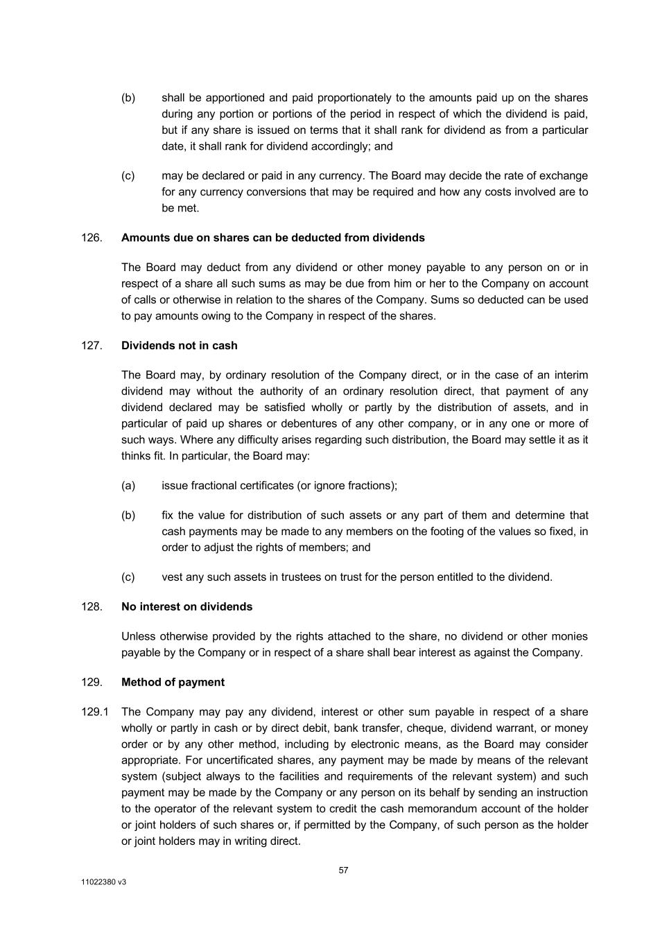 11022380 v3 57 (b) shall be apportioned and paid proportionately to the amounts paid up on the shares during any portion or portions of the period in respect of which the dividend is paid, but if any share is issued on terms that it shall rank for dividend as from a particular date, it shall rank for dividend accordingly; and (c) may be declared or paid in any currency. The Board may decide the rate of exchange for any currency conversions that may be required and how any costs involved are to be met. 126. Amounts due on shares can be deducted from dividends The Board may deduct from any dividend or other money payable to any person on or in respect of a share all such sums as may be due from him or her to the Company on account of calls or otherwise in relation to the shares of the Company. Sums so deducted can be used to pay amounts owing to the Company in respect of the shares. 127. Dividends not in cash The Board may, by ordinary resolution of the Company direct, or in the case of an interim dividend may without the authority of an ordinary resolution direct, that payment of any dividend declared may be satisfied wholly or partly by the distribution of assets, and in particular of paid up shares or debentures of any other company, or in any one or more of such ways. Where any difficulty arises regarding such distribution, the Board may settle it as it thinks fit. In particular, the Board may: (a) issue fractional certificates (or ignore fractions); (b) fix the value for distribution of such assets or any part of them and determine that cash payments may be made to any members on the footing of the values so fixed, in order to adjust the rights of members; and (c) vest any such assets in trustees on trust for the person entitled to the dividend. 128. No interest on dividends Unless otherwise provided by the rights attached to the share, no dividend or other monies payable by the Company or in respect of a share shall bear interest as against the Company. 129. Method of payment 129.1 The Company may pay any dividend, interest or other sum payable in respect of a share wholly or partly in cash or by direct debit, bank transfer, cheque, dividend warrant, or money order or by any other method, including by electronic means, as the Board may consider appropriate. For uncertificated shares, any payment may be made by means of the relevant system (subject always to the facilities and requirements of the relevant system) and such payment may be made by the Company or any person on its behalf by sending an instruction to the operator of the relevant system to credit the cash memorandum account of the holder or joint holders of such shares or, if permitted by the Company, of such person as the holder or joint holders may in writing direct.
