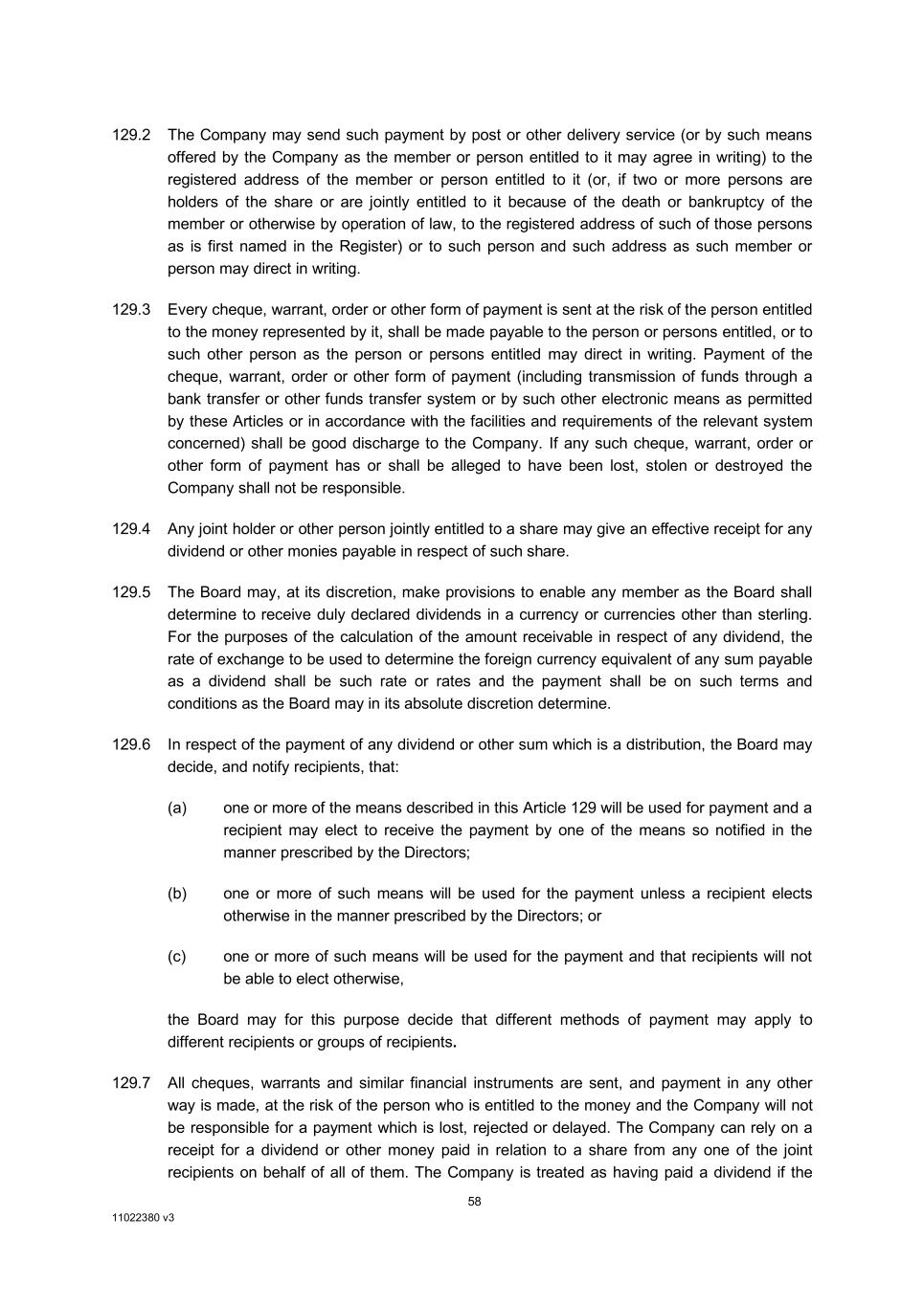 11022380 v3 58 129.2 The Company may send such payment by post or other delivery service (or by such means offered by the Company as the member or person entitled to it may agree in writing) to the registered address of the member or person entitled to it (or, if two or more persons are holders of the share or are jointly entitled to it because of the death or bankruptcy of the member or otherwise by operation of law, to the registered address of such of those persons as is first named in the Register) or to such person and such address as such member or person may direct in writing. 129.3 Every cheque, warrant, order or other form of payment is sent at the risk of the person entitled to the money represented by it, shall be made payable to the person or persons entitled, or to such other person as the person or persons entitled may direct in writing. Payment of the cheque, warrant, order or other form of payment (including transmission of funds through a bank transfer or other funds transfer system or by such other electronic means as permitted by these Articles or in accordance with the facilities and requirements of the relevant system concerned) shall be good discharge to the Company. If any such cheque, warrant, order or other form of payment has or shall be alleged to have been lost, stolen or destroyed the Company shall not be responsible. 129.4 Any joint holder or other person jointly entitled to a share may give an effective receipt for any dividend or other monies payable in respect of such share. 129.5 The Board may, at its discretion, make provisions to enable any member as the Board shall determine to receive duly declared dividends in a currency or currencies other than sterling. For the purposes of the calculation of the amount receivable in respect of any dividend, the rate of exchange to be used to determine the foreign currency equivalent of any sum payable as a dividend shall be such rate or rates and the payment shall be on such terms and conditions as the Board may in its absolute discretion determine. 129.6 In respect of the payment of any dividend or other sum which is a distribution, the Board may decide, and notify recipients, that: (a) one or more of the means described in this Article 129 will be used for payment and a recipient may elect to receive the payment by one of the means so notified in the manner prescribed by the Directors; (b) one or more of such means will be used for the payment unless a recipient elects otherwise in the manner prescribed by the Directors; or (c) one or more of such means will be used for the payment and that recipients will not be able to elect otherwise, the Board may for this purpose decide that different methods of payment may apply to different recipients or groups of recipients. 129.7 All cheques, warrants and similar financial instruments are sent, and payment in any other way is made, at the risk of the person who is entitled to the money and the Company will not be responsible for a payment which is lost, rejected or delayed. The Company can rely on a receipt for a dividend or other money paid in relation to a share from any one of the joint recipients on behalf of all of them. The Company is treated as having paid a dividend if the
