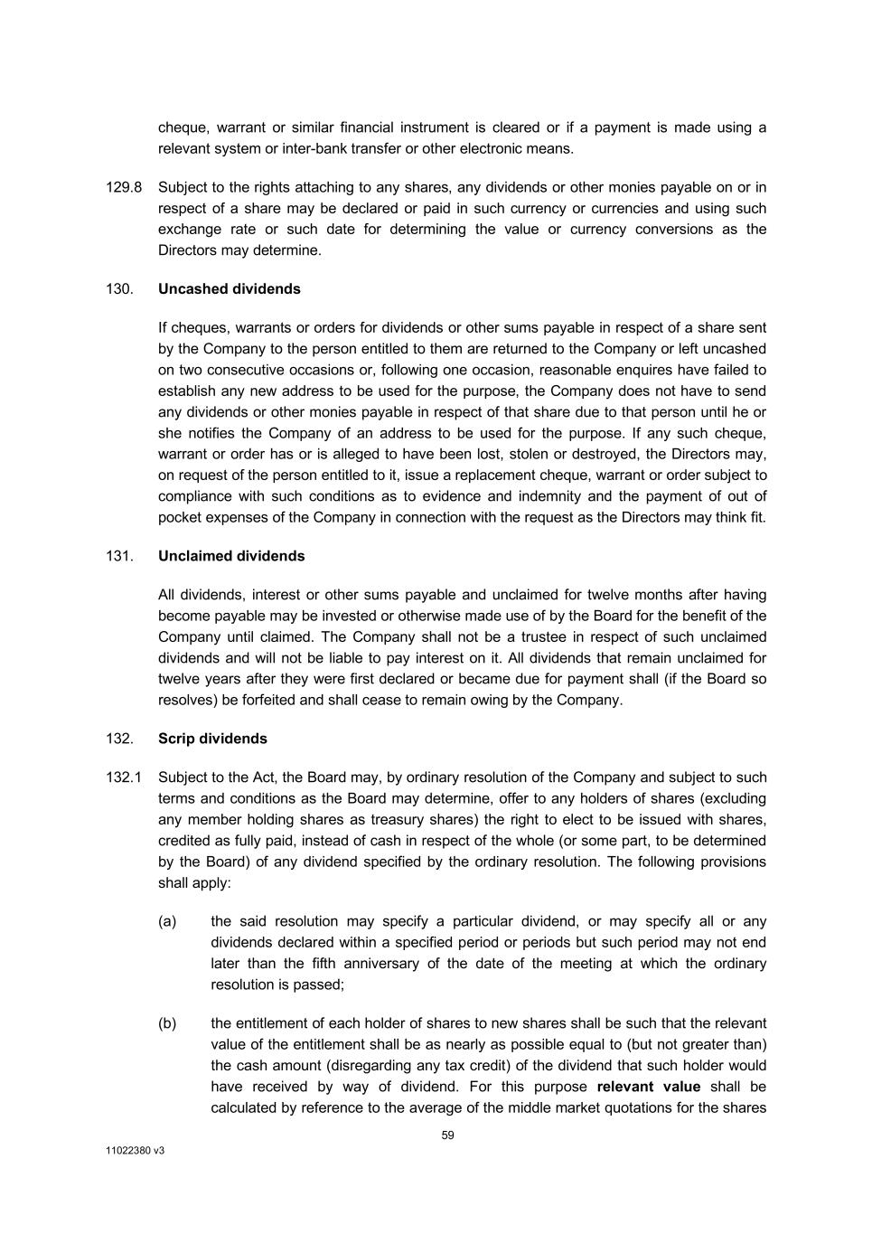 11022380 v3 59 cheque, warrant or similar financial instrument is cleared or if a payment is made using a relevant system or inter-bank transfer or other electronic means. 129.8 Subject to the rights attaching to any shares, any dividends or other monies payable on or in respect of a share may be declared or paid in such currency or currencies and using such exchange rate or such date for determining the value or currency conversions as the Directors may determine. 130. Uncashed dividends If cheques, warrants or orders for dividends or other sums payable in respect of a share sent by the Company to the person entitled to them are returned to the Company or left uncashed on two consecutive occasions or, following one occasion, reasonable enquires have failed to establish any new address to be used for the purpose, the Company does not have to send any dividends or other monies payable in respect of that share due to that person until he or she notifies the Company of an address to be used for the purpose. If any such cheque, warrant or order has or is alleged to have been lost, stolen or destroyed, the Directors may, on request of the person entitled to it, issue a replacement cheque, warrant or order subject to compliance with such conditions as to evidence and indemnity and the payment of out of pocket expenses of the Company in connection with the request as the Directors may think fit. 131. Unclaimed dividends All dividends, interest or other sums payable and unclaimed for twelve months after having become payable may be invested or otherwise made use of by the Board for the benefit of the Company until claimed. The Company shall not be a trustee in respect of such unclaimed dividends and will not be liable to pay interest on it. All dividends that remain unclaimed for twelve years after they were first declared or became due for payment shall (if the Board so resolves) be forfeited and shall cease to remain owing by the Company. 132. Scrip dividends 132.1 Subject to the Act, the Board may, by ordinary resolution of the Company and subject to such terms and conditions as the Board may determine, offer to any holders of shares (excluding any member holding shares as treasury shares) the right to elect to be issued with shares, credited as fully paid, instead of cash in respect of the whole (or some part, to be determined by the Board) of any dividend specified by the ordinary resolution. The following provisions shall apply: (a) the said resolution may specify a particular dividend, or may specify all or any dividends declared within a specified period or periods but such period may not end later than the fifth anniversary of the date of the meeting at which the ordinary resolution is passed; (b) the entitlement of each holder of shares to new shares shall be such that the relevant value of the entitlement shall be as nearly as possible equal to (but not greater than) the cash amount (disregarding any tax credit) of the dividend that such holder would have received by way of dividend. For this purpose relevant value shall be calculated by reference to the average of the middle market quotations for the shares