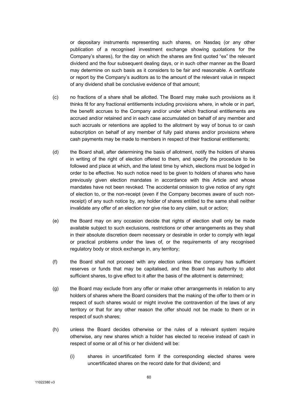 11022380 v3 60 or depositary instruments representing such shares, on Nasdaq (or any other publication of a recognised investment exchange showing quotations for the Company’s shares), for the day on which the shares are first quoted “ex” the relevant dividend and the four subsequent dealing days, or in such other manner as the Board may determine on such basis as it considers to be fair and reasonable. A certificate or report by the Company’s auditors as to the amount of the relevant value in respect of any dividend shall be conclusive evidence of that amount; (c) no fractions of a share shall be allotted. The Board may make such provisions as it thinks fit for any fractional entitlements including provisions where, in whole or in part, the benefit accrues to the Company and/or under which fractional entitlements are accrued and/or retained and in each case accumulated on behalf of any member and such accruals or retentions are applied to the allotment by way of bonus to or cash subscription on behalf of any member of fully paid shares and/or provisions where cash payments may be made to members in respect of their fractional entitlements; (d) the Board shall, after determining the basis of allotment, notify the holders of shares in writing of the right of election offered to them, and specify the procedure to be followed and place at which, and the latest time by which, elections must be lodged in order to be effective. No such notice need to be given to holders of shares who have previously given election mandates in accordance with this Article and whose mandates have not been revoked. The accidental omission to give notice of any right of election to, or the non-receipt (even if the Company becomes aware of such non- receipt) of any such notice by, any holder of shares entitled to the same shall neither invalidate any offer of an election nor give rise to any claim, suit or action; (e) the Board may on any occasion decide that rights of election shall only be made available subject to such exclusions, restrictions or other arrangements as they shall in their absolute discretion deem necessary or desirable in order to comply with legal or practical problems under the laws of, or the requirements of any recognised regulatory body or stock exchange in, any territory; (f) the Board shall not proceed with any election unless the company has sufficient reserves or funds that may be capitalised, and the Board has authority to allot sufficient shares, to give effect to it after the basis of the allotment is determined; (g) the Board may exclude from any offer or make other arrangements in relation to any holders of shares where the Board considers that the making of the offer to them or in respect of such shares would or might involve the contravention of the laws of any territory or that for any other reason the offer should not be made to them or in respect of such shares; (h) unless the Board decides otherwise or the rules of a relevant system require otherwise, any new shares which a holder has elected to receive instead of cash in respect of some or all of his or her dividend will be: (i) shares in uncertificated form if the corresponding elected shares were uncertificated shares on the record date for that dividend; and