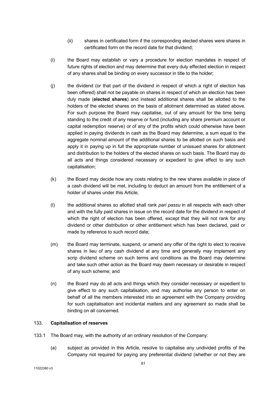 11022380 v3 61 (ii) shares in certificated form if the corresponding elected shares were shares in certificated form on the record date for that dividend; (i) the Board may establish or vary a procedure for election mandates in respect of future rights of election and may determine that every duly effected election in respect of any shares shall be binding on every successor in title to the holder; (j) the dividend (or that part of the dividend in respect of which a right of election has been offered) shall not be payable on shares in respect of which an election has been duly made (elected shares) and instead additional shares shall be allotted to the holders of the elected shares on the basis of allotment determined as stated above. For such purpose the Board may capitalise, out of any amount for the time being standing to the credit of any reserve or fund (including any share premium account or capital redemption reserve) or of any of the profits which could otherwise have been applied in paying dividends in cash as the Board may determine, a sum equal to the aggregate nominal amount of the additional shares to be allotted on such basis and apply it in paying up in full the appropriate number of unissued shares for allotment and distribution to the holders of the elected shares on such basis. The Board may do all acts and things considered necessary or expedient to give effect to any such capitalisation; (k) the Board may decide how any costs relating to the new shares available in place of a cash dividend will be met, including to deduct an amount from the entitlement of a holder of shares under this Article; (l) the additional shares so allotted shall rank pari passu in all respects with each other and with the fully paid shares in issue on the record date for the dividend in respect of which the right of election has been offered, except that they will not rank for any dividend or other distribution or other entitlement which has been declared, paid or made by reference to such record date; (m) the Board may terminate, suspend, or amend any offer of the right to elect to receive shares in lieu of any cash dividend at any time and generally may implement any scrip dividend scheme on such terms and conditions as the Board may determine and take such other action as the Board may deem necessary or desirable in respect of any such scheme; and (n) the Board may do all acts and things which they consider necessary or expedient to give effect to any such capitalisation, and may authorise any person to enter on behalf of all the members interested into an agreement with the Company providing for such capitalisation and incidental matters and any agreement so made shall be binding on all concerned. 133. Capitalisation of reserves 133.1 The Board may, with the authority of an ordinary resolution of the Company: (a) subject as provided in this Article, resolve to capitalise any undivided profits of the Company not required for paying any preferential dividend (whether or not they are