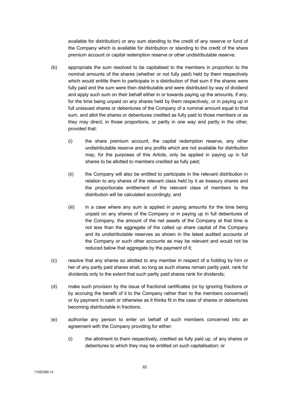 11022380 v3 62 available for distribution) or any sum standing to the credit of any reserve or fund of the Company which is available for distribution or standing to the credit of the share premium account or capital redemption reserve or other undistributable reserve; (b) appropriate the sum resolved to be capitalised to the members in proportion to the nominal amounts of the shares (whether or not fully paid) held by them respectively which would entitle them to participate in a distribution of that sum if the shares were fully paid and the sum were then distributable and were distributed by way of dividend and apply such sum on their behalf either in or towards paying up the amounts, if any, for the time being unpaid on any shares held by them respectively, or in paying up in full unissued shares or debentures of the Company of a nominal amount equal to that sum, and allot the shares or debentures credited as fully paid to those members or as they may direct, in those proportions, or partly in one way and partly in the other, provided that: (i) the share premium account, the capital redemption reserve, any other undistributable reserve and any profits which are not available for distribution may, for the purposes of this Article, only be applied in paying up in full shares to be allotted to members credited as fully paid; (ii) the Company will also be entitled to participate in the relevant distribution in relation to any shares of the relevant class held by it as treasury shares and the proportionate entitlement of the relevant class of members to the distribution will be calculated accordingly; and (iii) in a case where any sum is applied in paying amounts for the time being unpaid on any shares of the Company or in paying up in full debentures of the Company, the amount of the net assets of the Company at that time is not less than the aggregate of the called up share capital of the Company and its undistributable reserves as shown in the latest audited accounts of the Company or such other accounts as may be relevant and would not be reduced below that aggregate by the payment of it; (c) resolve that any shares so allotted to any member in respect of a holding by him or her of any partly paid shares shall, so long as such shares remain partly paid, rank for dividends only to the extent that such partly paid shares rank for dividends; (d) make such provision by the issue of fractional certificates (or by ignoring fractions or by accruing the benefit of it to the Company rather than to the members concerned) or by payment in cash or otherwise as it thinks fit in the case of shares or debentures becoming distributable in fractions; (e) authorise any person to enter on behalf of such members concerned into an agreement with the Company providing for either: (i) the allotment to them respectively, credited as fully paid up, of any shares or debentures to which they may be entitled on such capitalisation; or