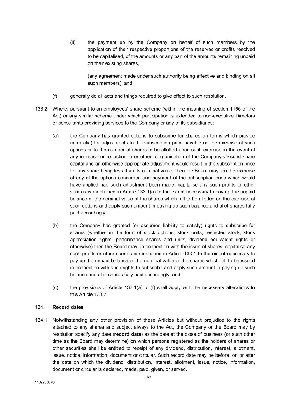 11022380 v3 63 (ii) the payment up by the Company on behalf of such members by the application of their respective proportions of the reserves or profits resolved to be capitalised, of the amounts or any part of the amounts remaining unpaid on their existing shares, (any agreement made under such authority being effective and binding on all such members); and (f) generally do all acts and things required to give effect to such resolution. 133.2 Where, pursuant to an employees’ share scheme (within the meaning of section 1166 of the Act) or any similar scheme under which participation is extended to non-executive Directors or consultants providing services to the Company or any of its subsidiaries: (a) the Company has granted options to subscribe for shares on terms which provide (inter alia) for adjustments to the subscription price payable on the exercise of such options or to the number of shares to be allotted upon such exercise in the event of any increase or reduction in or other reorganisation of the Company’s issued share capital and an otherwise appropriate adjustment would result in the subscription price for any share being less than its nominal value, then the Board may, on the exercise of any of the options concerned and payment of the subscription price which would have applied had such adjustment been made, capitalise any such profits or other sum as is mentioned in Article 133.1(a) to the extent necessary to pay up the unpaid balance of the nominal value of the shares which fall to be allotted on the exercise of such options and apply such amount in paying up such balance and allot shares fully paid accordingly; (b) the Company has granted (or assumed liability to satisfy) rights to subscribe for shares (whether in the form of stock options, stock units, restricted stock, stock appreciation rights, performance shares and units, dividend equivalent rights or otherwise) then the Board may, in connection with the issue of shares, capitalise any such profits or other sum as is mentioned in Article 133.1 to the extent necessary to pay up the unpaid balance of the nominal value of the shares which fall to be issued in connection with such rights to subscribe and apply such amount in paying up such balance and allot shares fully paid accordingly; and (c) the provisions of Article 133.1(a) to (f) shall apply with the necessary alterations to this Article 133.2. 134. Record dates 134.1 Notwithstanding any other provision of these Articles but without prejudice to the rights attached to any shares and subject always to the Act, the Company or the Board may by resolution specify any date (record date) as the date at the close of business (or such other time as the Board may determine) on which persons registered as the holders of shares or other securities shall be entitled to receipt of any dividend, distribution, interest, allotment, issue, notice, information, document or circular. Such record date may be before, on or after the date on which the dividend, distribution, interest, allotment, issue, notice, information, document or circular is declared, made, paid, given, or served.