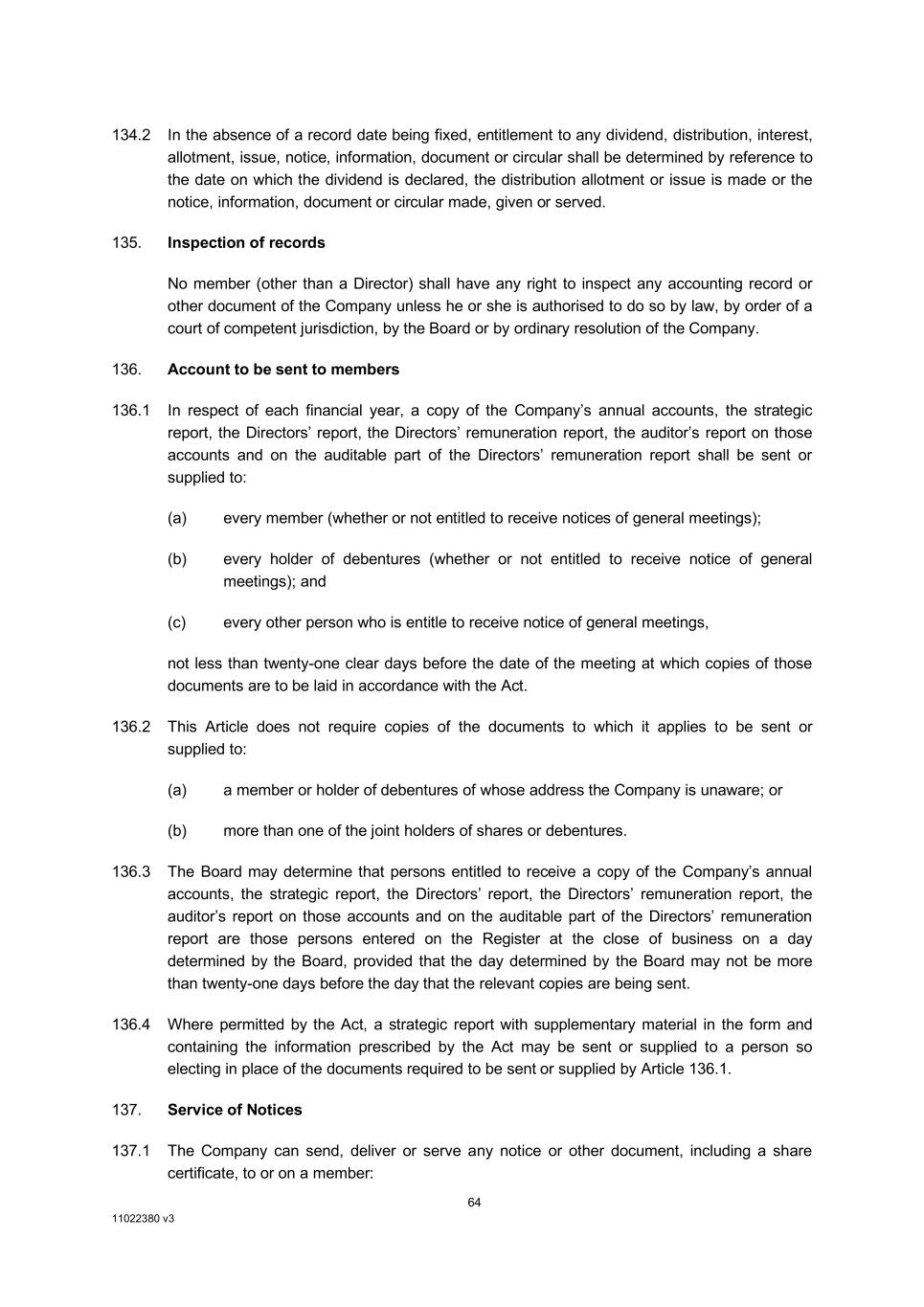 11022380 v3 64 134.2 In the absence of a record date being fixed, entitlement to any dividend, distribution, interest, allotment, issue, notice, information, document or circular shall be determined by reference to the date on which the dividend is declared, the distribution allotment or issue is made or the notice, information, document or circular made, given or served. 135. Inspection of records No member (other than a Director) shall have any right to inspect any accounting record or other document of the Company unless he or she is authorised to do so by law, by order of a court of competent jurisdiction, by the Board or by ordinary resolution of the Company. 136. Account to be sent to members 136.1 In respect of each financial year, a copy of the Company’s annual accounts, the strategic report, the Directors’ report, the Directors’ remuneration report, the auditor’s report on those accounts and on the auditable part of the Directors’ remuneration report shall be sent or supplied to: (a) every member (whether or not entitled to receive notices of general meetings); (b) every holder of debentures (whether or not entitled to receive notice of general meetings); and (c) every other person who is entitle to receive notice of general meetings, not less than twenty-one clear days before the date of the meeting at which copies of those documents are to be laid in accordance with the Act. 136.2 This Article does not require copies of the documents to which it applies to be sent or supplied to: (a) a member or holder of debentures of whose address the Company is unaware; or (b) more than one of the joint holders of shares or debentures. 136.3 The Board may determine that persons entitled to receive a copy of the Company’s annual accounts, the strategic report, the Directors’ report, the Directors’ remuneration report, the auditor’s report on those accounts and on the auditable part of the Directors’ remuneration report are those persons entered on the Register at the close of business on a day determined by the Board, provided that the day determined by the Board may not be more than twenty-one days before the day that the relevant copies are being sent. 136.4 Where permitted by the Act, a strategic report with supplementary material in the form and containing the information prescribed by the Act may be sent or supplied to a person so electing in place of the documents required to be sent or supplied by Article 136.1. 137. Service of Notices 137.1 The Company can send, deliver or serve any notice or other document, including a share certificate, to or on a member: