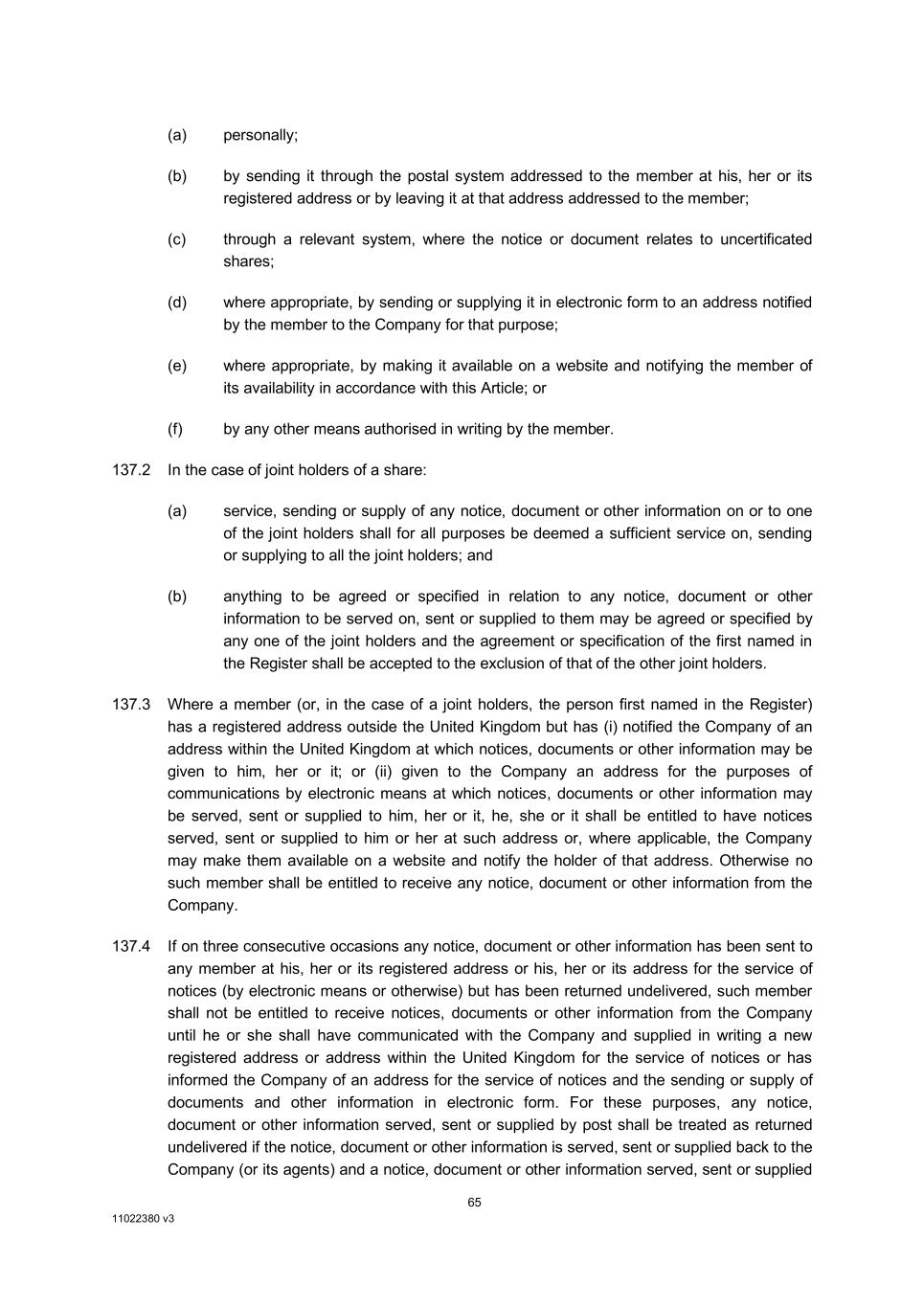11022380 v3 65 (a) personally; (b) by sending it through the postal system addressed to the member at his, her or its registered address or by leaving it at that address addressed to the member; (c) through a relevant system, where the notice or document relates to uncertificated shares; (d) where appropriate, by sending or supplying it in electronic form to an address notified by the member to the Company for that purpose; (e) where appropriate, by making it available on a website and notifying the member of its availability in accordance with this Article; or (f) by any other means authorised in writing by the member. 137.2 In the case of joint holders of a share: (a) service, sending or supply of any notice, document or other information on or to one of the joint holders shall for all purposes be deemed a sufficient service on, sending or supplying to all the joint holders; and (b) anything to be agreed or specified in relation to any notice, document or other information to be served on, sent or supplied to them may be agreed or specified by any one of the joint holders and the agreement or specification of the first named in the Register shall be accepted to the exclusion of that of the other joint holders. 137.3 Where a member (or, in the case of a joint holders, the person first named in the Register) has a registered address outside the United Kingdom but has (i) notified the Company of an address within the United Kingdom at which notices, documents or other information may be given to him, her or it; or (ii) given to the Company an address for the purposes of communications by electronic means at which notices, documents or other information may be served, sent or supplied to him, her or it, he, she or it shall be entitled to have notices served, sent or supplied to him or her at such address or, where applicable, the Company may make them available on a website and notify the holder of that address. Otherwise no such member shall be entitled to receive any notice, document or other information from the Company. 137.4 If on three consecutive occasions any notice, document or other information has been sent to any member at his, her or its registered address or his, her or its address for the service of notices (by electronic means or otherwise) but has been returned undelivered, such member shall not be entitled to receive notices, documents or other information from the Company until he or she shall have communicated with the Company and supplied in writing a new registered address or address within the United Kingdom for the service of notices or has informed the Company of an address for the service of notices and the sending or supply of documents and other information in electronic form. For these purposes, any notice, document or other information served, sent or supplied by post shall be treated as returned undelivered if the notice, document or other information is served, sent or supplied back to the Company (or its agents) and a notice, document or other information served, sent or supplied
