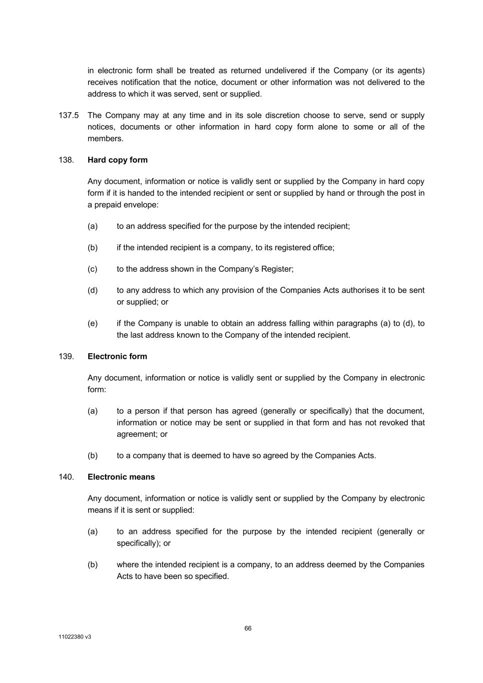 11022380 v3 66 in electronic form shall be treated as returned undelivered if the Company (or its agents) receives notification that the notice, document or other information was not delivered to the address to which it was served, sent or supplied. 137.5 The Company may at any time and in its sole discretion choose to serve, send or supply notices, documents or other information in hard copy form alone to some or all of the members. 138. Hard copy form Any document, information or notice is validly sent or supplied by the Company in hard copy form if it is handed to the intended recipient or sent or supplied by hand or through the post in a prepaid envelope: (a) to an address specified for the purpose by the intended recipient; (b) if the intended recipient is a company, to its registered office; (c) to the address shown in the Company’s Register; (d) to any address to which any provision of the Companies Acts authorises it to be sent or supplied; or (e) if the Company is unable to obtain an address falling within paragraphs (a) to (d), to the last address known to the Company of the intended recipient. 139. Electronic form Any document, information or notice is validly sent or supplied by the Company in electronic form: (a) to a person if that person has agreed (generally or specifically) that the document, information or notice may be sent or supplied in that form and has not revoked that agreement; or (b) to a company that is deemed to have so agreed by the Companies Acts. 140. Electronic means Any document, information or notice is validly sent or supplied by the Company by electronic means if it is sent or supplied: (a) to an address specified for the purpose by the intended recipient (generally or specifically); or (b) where the intended recipient is a company, to an address deemed by the Companies Acts to have been so specified.