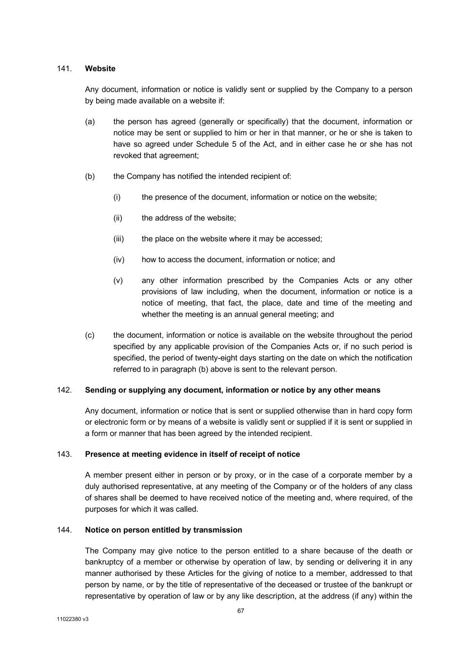 11022380 v3 67 141. Website Any document, information or notice is validly sent or supplied by the Company to a person by being made available on a website if: (a) the person has agreed (generally or specifically) that the document, information or notice may be sent or supplied to him or her in that manner, or he or she is taken to have so agreed under Schedule 5 of the Act, and in either case he or she has not revoked that agreement; (b) the Company has notified the intended recipient of: (i) the presence of the document, information or notice on the website; (ii) the address of the website; (iii) the place on the website where it may be accessed; (iv) how to access the document, information or notice; and (v) any other information prescribed by the Companies Acts or any other provisions of law including, when the document, information or notice is a notice of meeting, that fact, the place, date and time of the meeting and whether the meeting is an annual general meeting; and (c) the document, information or notice is available on the website throughout the period specified by any applicable provision of the Companies Acts or, if no such period is specified, the period of twenty-eight days starting on the date on which the notification referred to in paragraph (b) above is sent to the relevant person. 142. Sending or supplying any document, information or notice by any other means Any document, information or notice that is sent or supplied otherwise than in hard copy form or electronic form or by means of a website is validly sent or supplied if it is sent or supplied in a form or manner that has been agreed by the intended recipient. 143. Presence at meeting evidence in itself of receipt of notice A member present either in person or by proxy, or in the case of a corporate member by a duly authorised representative, at any meeting of the Company or of the holders of any class of shares shall be deemed to have received notice of the meeting and, where required, of the purposes for which it was called. 144. Notice on person entitled by transmission The Company may give notice to the person entitled to a share because of the death or bankruptcy of a member or otherwise by operation of law, by sending or delivering it in any manner authorised by these Articles for the giving of notice to a member, addressed to that person by name, or by the title of representative of the deceased or trustee of the bankrupt or representative by operation of law or by any like description, at the address (if any) within the