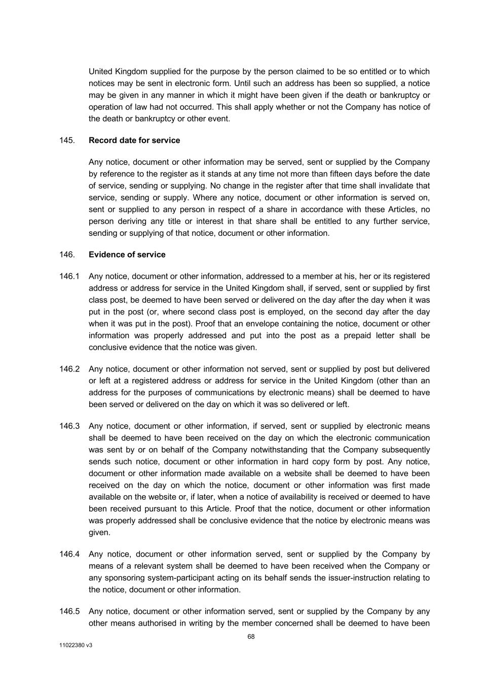 11022380 v3 68 United Kingdom supplied for the purpose by the person claimed to be so entitled or to which notices may be sent in electronic form. Until such an address has been so supplied, a notice may be given in any manner in which it might have been given if the death or bankruptcy or operation of law had not occurred. This shall apply whether or not the Company has notice of the death or bankruptcy or other event. 145. Record date for service Any notice, document or other information may be served, sent or supplied by the Company by reference to the register as it stands at any time not more than fifteen days before the date of service, sending or supplying. No change in the register after that time shall invalidate that service, sending or supply. Where any notice, document or other information is served on, sent or supplied to any person in respect of a share in accordance with these Articles, no person deriving any title or interest in that share shall be entitled to any further service, sending or supplying of that notice, document or other information. 146. Evidence of service 146.1 Any notice, document or other information, addressed to a member at his, her or its registered address or address for service in the United Kingdom shall, if served, sent or supplied by first class post, be deemed to have been served or delivered on the day after the day when it was put in the post (or, where second class post is employed, on the second day after the day when it was put in the post). Proof that an envelope containing the notice, document or other information was properly addressed and put into the post as a prepaid letter shall be conclusive evidence that the notice was given. 146.2 Any notice, document or other information not served, sent or supplied by post but delivered or left at a registered address or address for service in the United Kingdom (other than an address for the purposes of communications by electronic means) shall be deemed to have been served or delivered on the day on which it was so delivered or left. 146.3 Any notice, document or other information, if served, sent or supplied by electronic means shall be deemed to have been received on the day on which the electronic communication was sent by or on behalf of the Company notwithstanding that the Company subsequently sends such notice, document or other information in hard copy form by post. Any notice, document or other information made available on a website shall be deemed to have been received on the day on which the notice, document or other information was first made available on the website or, if later, when a notice of availability is received or deemed to have been received pursuant to this Article. Proof that the notice, document or other information was properly addressed shall be conclusive evidence that the notice by electronic means was given. 146.4 Any notice, document or other information served, sent or supplied by the Company by means of a relevant system shall be deemed to have been received when the Company or any sponsoring system-participant acting on its behalf sends the issuer-instruction relating to the notice, document or other information. 146.5 Any notice, document or other information served, sent or supplied by the Company by any other means authorised in writing by the member concerned shall be deemed to have been