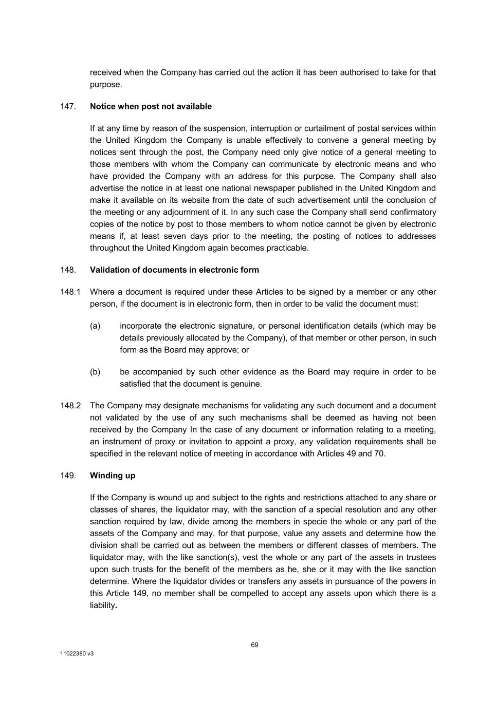 11022380 v3 69 received when the Company has carried out the action it has been authorised to take for that purpose. 147. Notice when post not available If at any time by reason of the suspension, interruption or curtailment of postal services within the United Kingdom the Company is unable effectively to convene a general meeting by notices sent through the post, the Company need only give notice of a general meeting to those members with whom the Company can communicate by electronic means and who have provided the Company with an address for this purpose. The Company shall also advertise the notice in at least one national newspaper published in the United Kingdom and make it available on its website from the date of such advertisement until the conclusion of the meeting or any adjournment of it. In any such case the Company shall send confirmatory copies of the notice by post to those members to whom notice cannot be given by electronic means if, at least seven days prior to the meeting, the posting of notices to addresses throughout the United Kingdom again becomes practicable. 148. Validation of documents in electronic form 148.1 Where a document is required under these Articles to be signed by a member or any other person, if the document is in electronic form, then in order to be valid the document must: (a) incorporate the electronic signature, or personal identification details (which may be details previously allocated by the Company), of that member or other person, in such form as the Board may approve; or (b) be accompanied by such other evidence as the Board may require in order to be satisfied that the document is genuine. 148.2 The Company may designate mechanisms for validating any such document and a document not validated by the use of any such mechanisms shall be deemed as having not been received by the Company In the case of any document or information relating to a meeting, an instrument of proxy or invitation to appoint a proxy, any validation requirements shall be specified in the relevant notice of meeting in accordance with Articles 49 and 70. 149. Winding up If the Company is wound up and subject to the rights and restrictions attached to any share or classes of shares, the liquidator may, with the sanction of a special resolution and any other sanction required by law, divide among the members in specie the whole or any part of the assets of the Company and may, for that purpose, value any assets and determine how the division shall be carried out as between the members or different classes of members. The liquidator may, with the like sanction(s), vest the whole or any part of the assets in trustees upon such trusts for the benefit of the members as he, she or it may with the like sanction determine. Where the liquidator divides or transfers any assets in pursuance of the powers in this Article 149, no member shall be compelled to accept any assets upon which there is a liability.