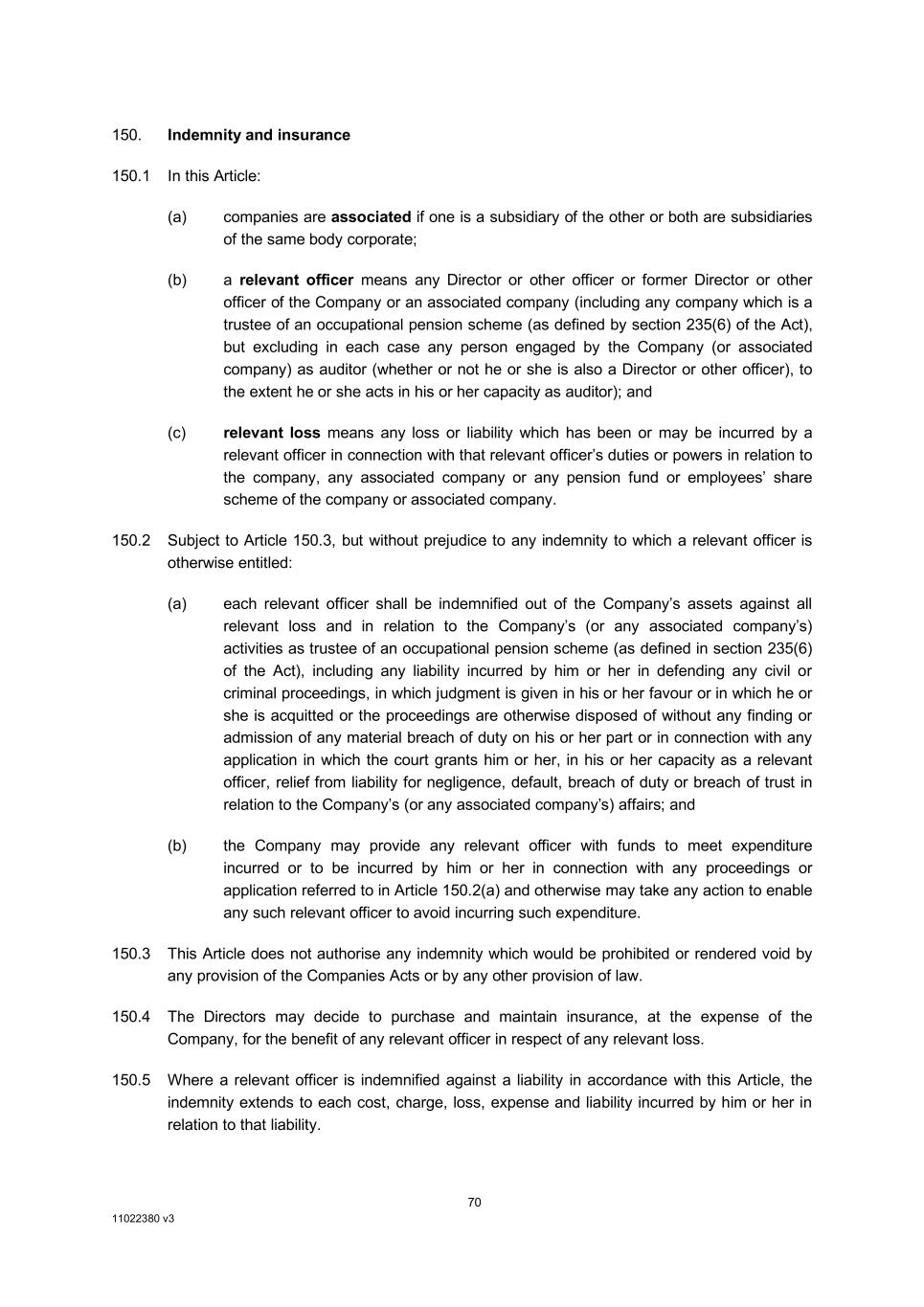 11022380 v3 70 150. Indemnity and insurance 150.1 In this Article: (a) companies are associated if one is a subsidiary of the other or both are subsidiaries of the same body corporate; (b) a relevant officer means any Director or other officer or former Director or other officer of the Company or an associated company (including any company which is a trustee of an occupational pension scheme (as defined by section 235(6) of the Act), but excluding in each case any person engaged by the Company (or associated company) as auditor (whether or not he or she is also a Director or other officer), to the extent he or she acts in his or her capacity as auditor); and (c) relevant loss means any loss or liability which has been or may be incurred by a relevant officer in connection with that relevant officer’s duties or powers in relation to the company, any associated company or any pension fund or employees’ share scheme of the company or associated company. 150.2 Subject to Article 150.3, but without prejudice to any indemnity to which a relevant officer is otherwise entitled: (a) each relevant officer shall be indemnified out of the Company’s assets against all relevant loss and in relation to the Company’s (or any associated company’s) activities as trustee of an occupational pension scheme (as defined in section 235(6) of the Act), including any liability incurred by him or her in defending any civil or criminal proceedings, in which judgment is given in his or her favour or in which he or she is acquitted or the proceedings are otherwise disposed of without any finding or admission of any material breach of duty on his or her part or in connection with any application in which the court grants him or her, in his or her capacity as a relevant officer, relief from liability for negligence, default, breach of duty or breach of trust in relation to the Company’s (or any associated company’s) affairs; and (b) the Company may provide any relevant officer with funds to meet expenditure incurred or to be incurred by him or her in connection with any proceedings or application referred to in Article 150.2(a) and otherwise may take any action to enable any such relevant officer to avoid incurring such expenditure. 150.3 This Article does not authorise any indemnity which would be prohibited or rendered void by any provision of the Companies Acts or by any other provision of law. 150.4 The Directors may decide to purchase and maintain insurance, at the expense of the Company, for the benefit of any relevant officer in respect of any relevant loss. 150.5 Where a relevant officer is indemnified against a liability in accordance with this Article, the indemnity extends to each cost, charge, loss, expense and liability incurred by him or her in relation to that liability.