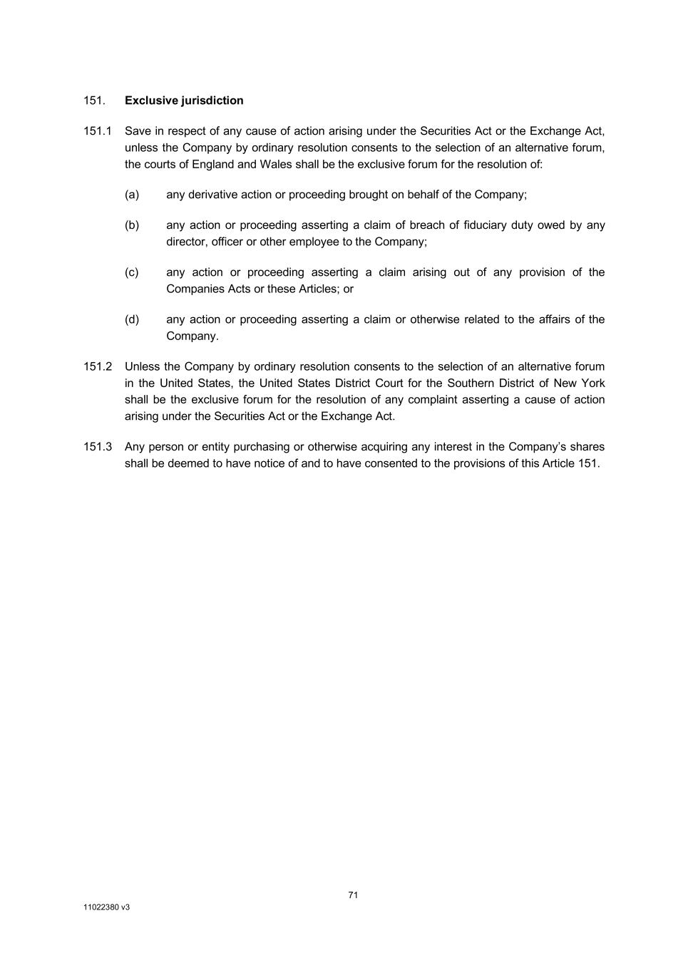 11022380 v3 71 151. Exclusive jurisdiction 151.1 Save in respect of any cause of action arising under the Securities Act or the Exchange Act, unless the Company by ordinary resolution consents to the selection of an alternative forum, the courts of England and Wales shall be the exclusive forum for the resolution of: (a) any derivative action or proceeding brought on behalf of the Company; (b) any action or proceeding asserting a claim of breach of fiduciary duty owed by any director, officer or other employee to the Company; (c) any action or proceeding asserting a claim arising out of any provision of the Companies Acts or these Articles; or (d) any action or proceeding asserting a claim or otherwise related to the affairs of the Company. 151.2 Unless the Company by ordinary resolution consents to the selection of an alternative forum in the United States, the United States District Court for the Southern District of New York shall be the exclusive forum for the resolution of any complaint asserting a cause of action arising under the Securities Act or the Exchange Act. 151.3 Any person or entity purchasing or otherwise acquiring any interest in the Company’s shares shall be deemed to have notice of and to have consented to the provisions of this Article 151.